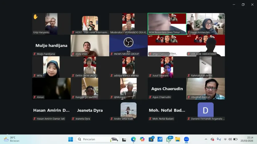 TheJatim.com – Badan Eksekutif Mahasiswa Nusantara (BEMNus) Jawa Timur menggelar diskusi daring bertajuk “Dari UU TNI ke Air Keras” pada Rabu (25/3/2026) malam. Agenda ini menghadirkan sejumlah akademisi, aktivis, dan pegiat hak asasi manusia untuk membedah dugaan jaringan kekuasaan di balik serangan terhadap Andrie Yunus sekaligus menyoroti kembali mandeknya reformasi sektor keamanan di Indonesia.
