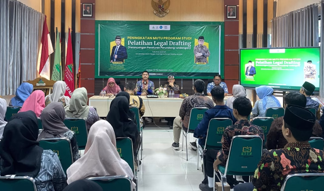 “Pelatihan legal drafting ini juga merupakan langkah konkret dalam menghubungkan mahasiswa dengan praktik hukum yang nyata,” ujarnya saat membuka acara pelatihan Legal Drafting di Aula Fakultas Syariah UIN KHAS Jember, Kamis (18/9/2025).