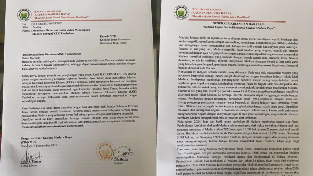 “Betul bahwa kami bersurat hari ini kepada ibunda Gubernur untuk mendorong agar Gubernur segera menjadikan Madura sebagai Kawasan Ekonomi Khusus (KEK) Tembakau,” ujar Umam, Senin (03/11/2025).